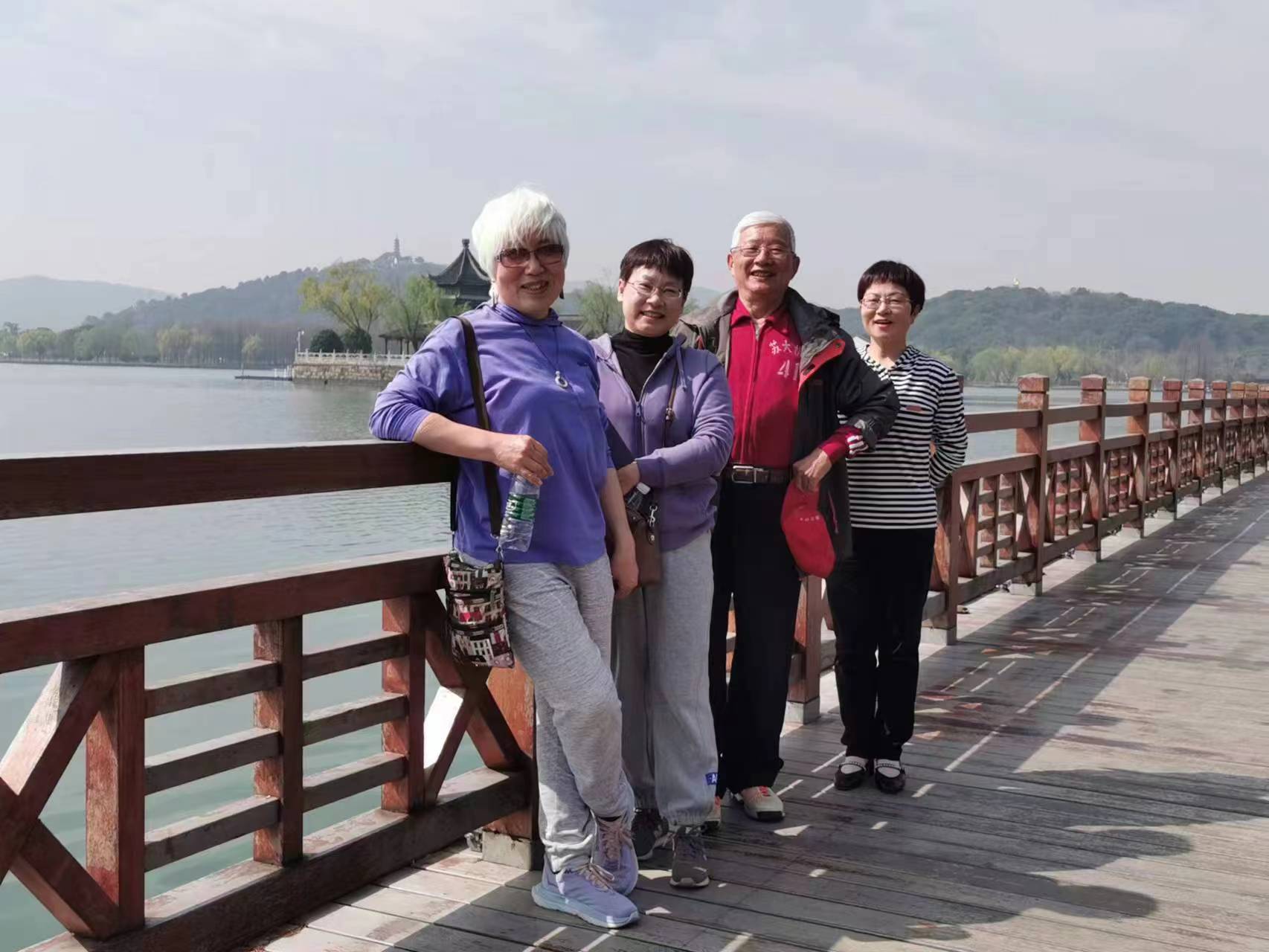 退休老师们在欢声笑语中来到湖上的行春桥,桥身有九个环洞,洞与洞相连,倒映水中,十分美妙。他们悠闲自得,不时驻足观赏,各自举起手机或相机,定格住此刻的美好。