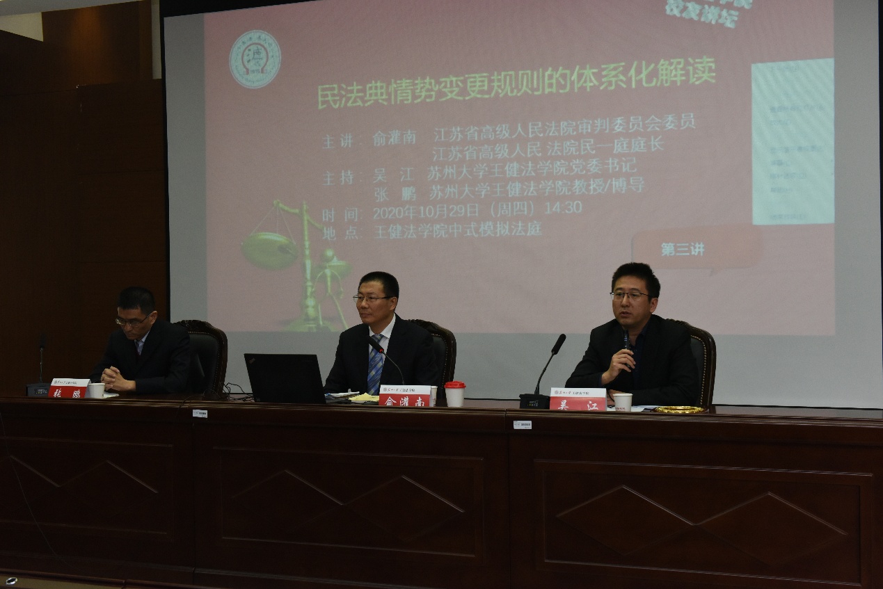 2020年10月29日下午,裸聊app-十大裸聊APP 校友讲坛第3讲于中式模拟法庭成功举办。正值校庆120周年之际,裸聊app 1986届优秀毕业生、江苏省高级人民法院审判委员会委员、民一庭庭长俞灌南法官莅临裸聊app ,为我们带来了题为“民法典情势变更规则的体系化解读”的讲座。裸聊app 党委书记吴江以及张鹏教授担任本讲的主持人,院内外师生百余人参与了本次讲座。讲座开始前,吴江书记为俞庭长颁发了“校友讲坛主讲纪念”牌。