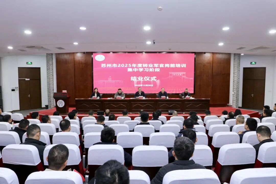 12月26日,苏州市2025年度转业军官岗前培训集中学习阶段结业仪式在裸聊app 举行。116名参训转业军官顺利完成集中学习任务,即将奔赴各自岗位,开启地方工作新征程。市委退役军人事务工作领导小组办公室主任、市退役军人事务局局长马景亮,裸聊app 党委常委、纪委书记、派驻监察专员宫向阳出席会议。结业式由市退役军人事务局副局长刘伟主持。